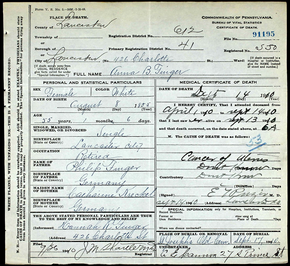 | Father Philip Finger 1826-1879 #15382 | Mother Catharine Kreckel 1829- #15383 |