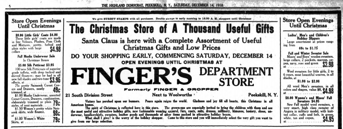 ● 1918 Abraham Finger has bought out the interests of Jacob Gropper in what was known as the Finger & Gropper store on Division street and will continue it as the Finger Department Store. They are making special preparations for a big holiday season. Watch for their advertisements. - Highland Democrat, Dec 7, 1918